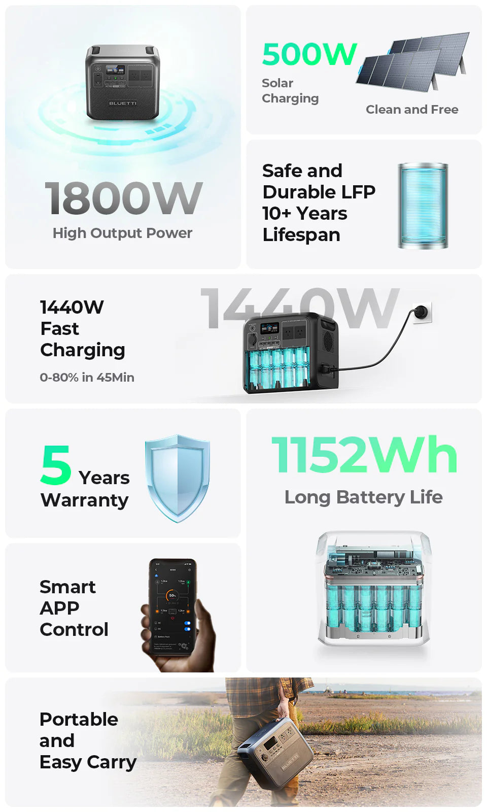 Designed for both indoor and outdoor scenarios, AC180 is highly capable as it has a capacity of 1,152Wh and continuous output of 1,800W. Thanks to its super-fast charging speed and portable design, it's a grab-and-go power station for numerous applications. The BLUETTI App is also available to make remote control and real-time monitoring incredibly convenient with just a few swipes on your phone.